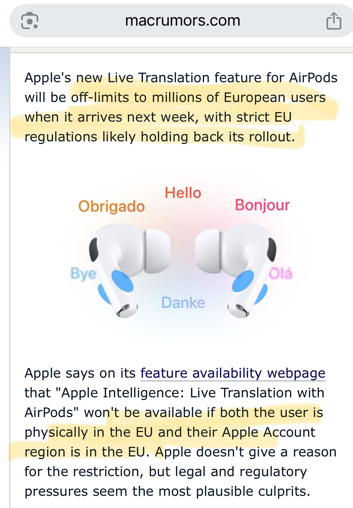 Die neue Live-Übersetzung der AirPods wird in der EU blockiert. (Die Funktion übersetzt das gesprochene Wort des gegenüber im AirPod in die eigene Sprache).